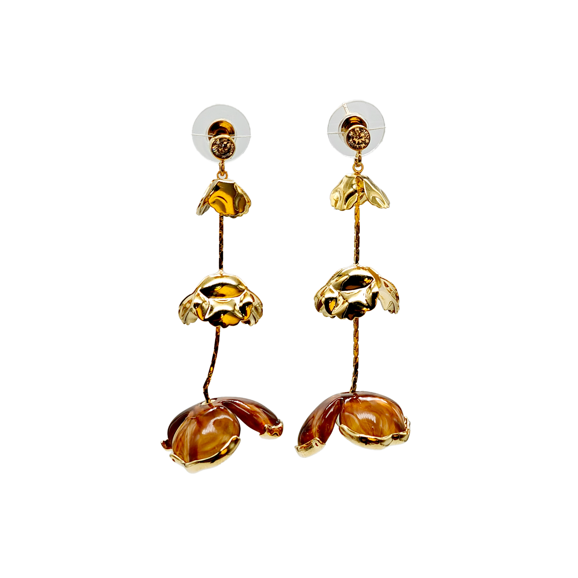 The top portion shines in polished gold-toned metalwork, while the bottom petals showcase a rich, amber-inspired enamel finish, adding warmth, contrast, and timeless charm. Lightweight yet impactful, these long danglers are designed to move beautifully with every step, making them the perfect accessory for both day and night.