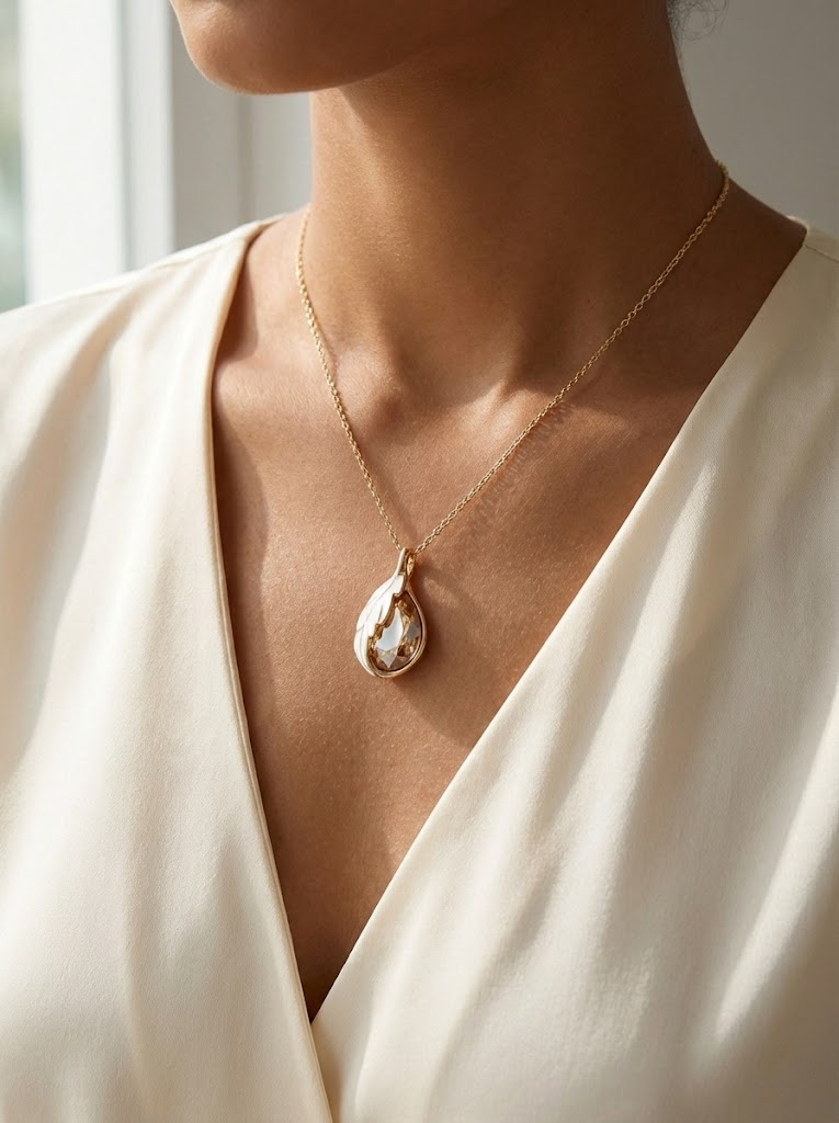 Set in polished gold-toned metal, the pendant hangs from a delicate cable chain that sits beautifully on the neckline. It’s a sophisticated choice for those who appreciate jewelry that is both classic and contemporary.